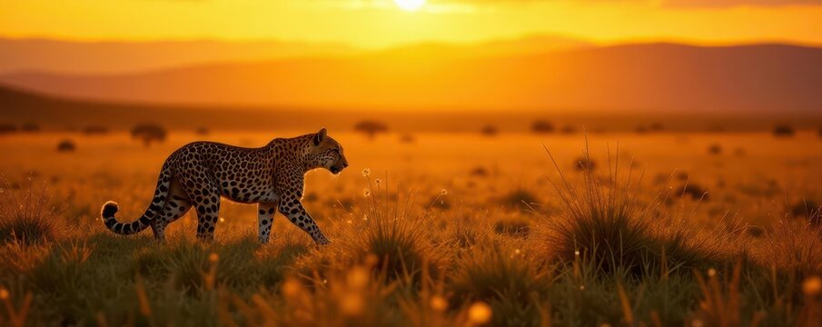 Golden light fades over savannah as leopard stalks unsuspecting prey, leopard, grasslands