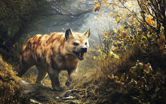 A Borhyaena, its jaws agape, prepares to strike at its unsuspecting prey, its muscular frame and predatory instincts hinting at the primal ferocity of this ancient carnivore