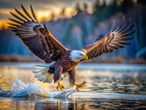 Majestic eagle plummets downwards, sharp talons outstretched, eyes fixed intently on unsuspecting prey, wings tucked in, feathers ruffled, in a dramatic hunt scene.