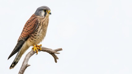 Sharp‑eyed kestrel poised on weathered branch, speckled russet back and slate‑gray head glowing against soft sky, capturing silent focus of a small falcon ready to dive on unsuspecting prey