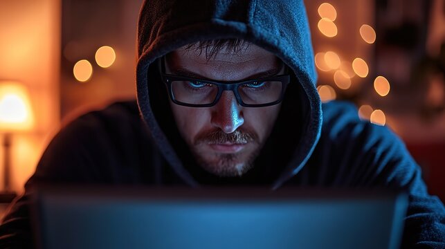 A hooded figure depicting a hacker, deeply engrossed in coding or cyber attacks, with a complex digital overlay of coding elements and bright neon colors.