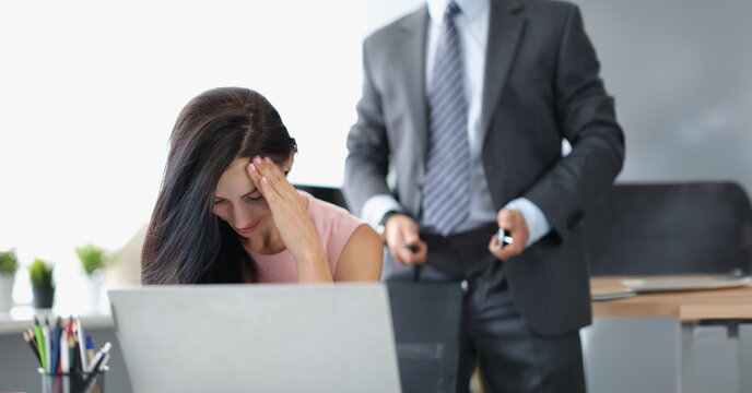 Portrait of secretary close face feeling ashamed and shy because of her boss harassment. Man stand behind with unzip belt on pants. Harassment at workplace