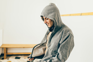Like and dislike. Thumbs up and down sign of a man's and woman hand. The wrist came out through the torn hole in yellow paper and shows fingers up and down. Bad and good concept.