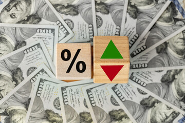 US dollars, Percent, up or down, arrow symbol, business concept. Economic and financial analysis, interest rates, stocks, bonds, ranking, mortgage, loan rates