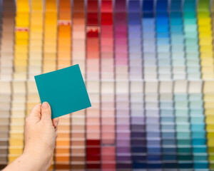 teal paint colour card held up in front of paint sample wall