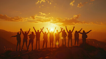 from behind view group of people standing with arms up in front of magical sunset in mountains in success and achievement concepts