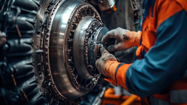 Plane engine repair showing a close-up of a turbine being adjusted by a professional mechanic, focusing on technical precision