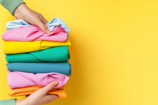 A vibrant collection of neatly folded clothes in various colors against a cheerful yellow background.