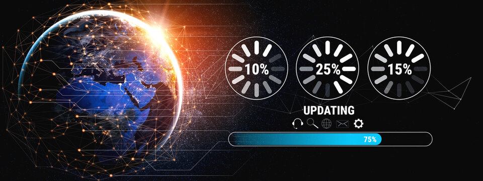 A concept of a system update and software installation. A progress bar and loading icons showing the update percentage and status. Motif