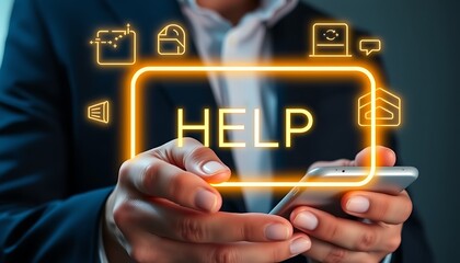 Person holding smartphone with glowing HELP icon and digital service symbols help support