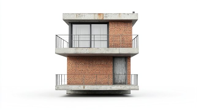 A two-story, brick and concrete building with a balcony on each level, a single door on the lower level and a single window on the upper level, all against a white background