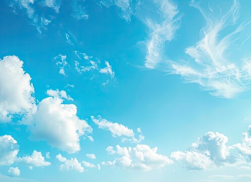 A vibrant blue sky canvas, adorned with fluffy white cumulus clouds scattered across its expanse, features wispy cirrus clouds streaking delicately across the upper regions