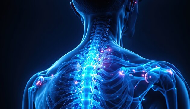 Illuminated human upper torso structure displays glowing spinal column and shoulder region detail