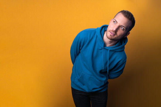 Standing asian man crossing arms, facing right, observing teal data overlay in modern office