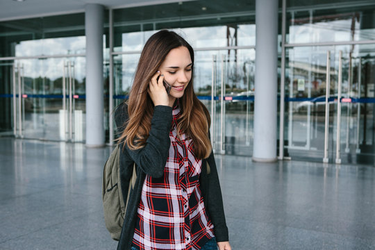 Young beautiful tourist girl at the airport or near the shopping center or the station calls a taxi or talking on a cell phone or talking to friends using a mobile phone.