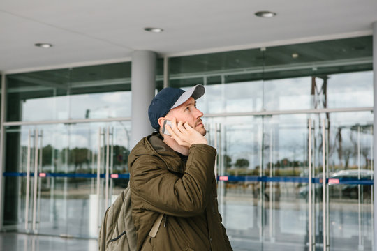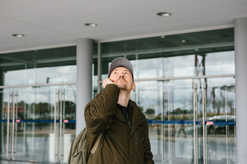 A young male tourist at the airport or near a shopping center or station calls a taxi or talks on a cell phone or communicates with friends using a mobile phone