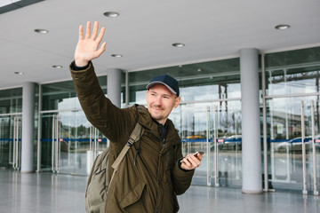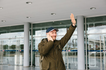 A young male tourist at the airport or near a shopping center or station calls a taxi or talks on a cell phone or communicates with friends using a mobile phone.
