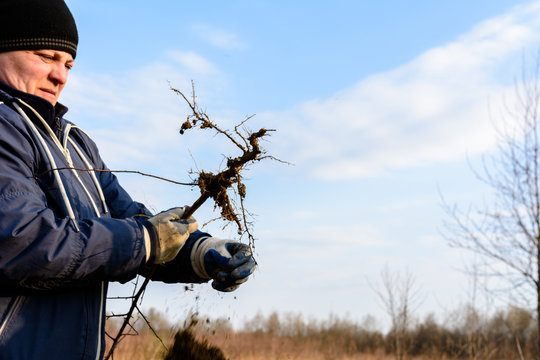A woman in her hands against the sky holds a young tree dug up with roots.