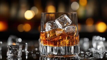 Close-up of a crystal whiskey glass with ice and a golden pour, bar ambiance with warm lighting