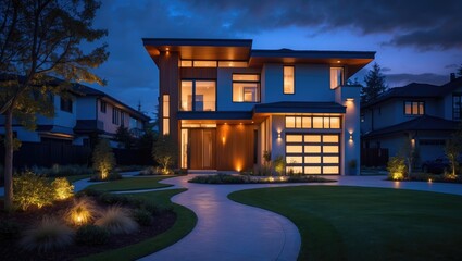 Spacious modern luxury residence during dusk, nighttime in suburban area.