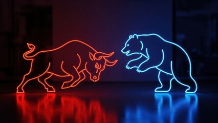 Glowing neon stock market chart showing bullish uptrend with red arrow and data ticker
