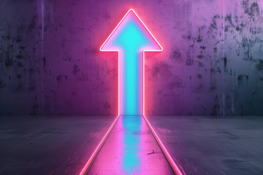 Neon arrow sign pointing upwards in a dark, grungy setting with vibrant pink and blue lighting. Futuristic and modern design concept.