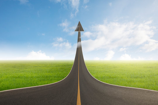 A road turning into an arrow rising upward with success, symbolizing the direction to success