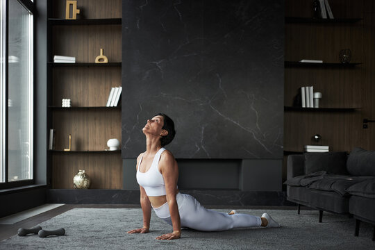 Active woman practicing upward facing dog position on mat at home