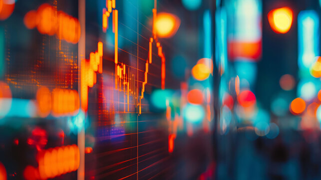 Futuristic Stock Market Data in Urban Setting. Vibrant city at night with illuminated skyscrapers and glowing stock market data overlays, symbolizing the intersection of technology and finance.
