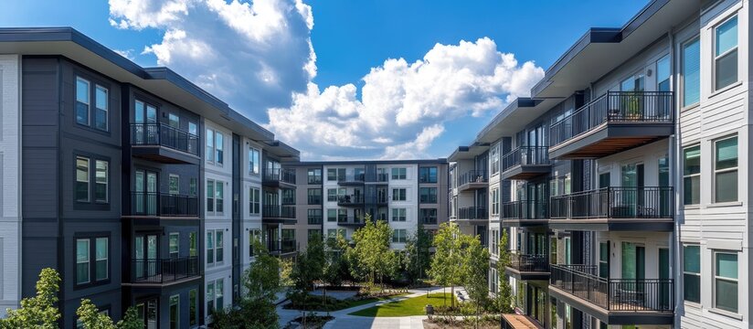 New apartment buildings featuring windows and balconies in a modern architectural style complemented by outdoor amenities in a mixed media format