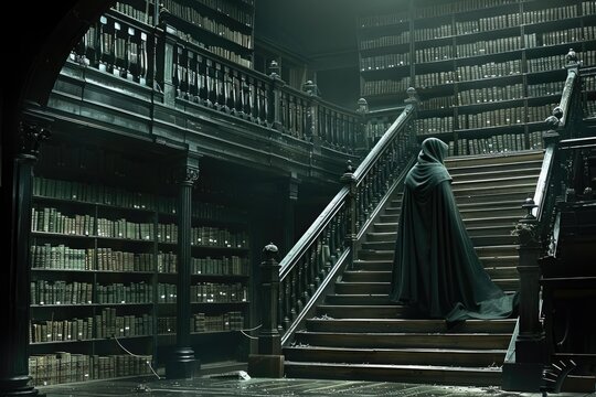 Vaulted gothic library with red floor lamp casting moody warm ambient light