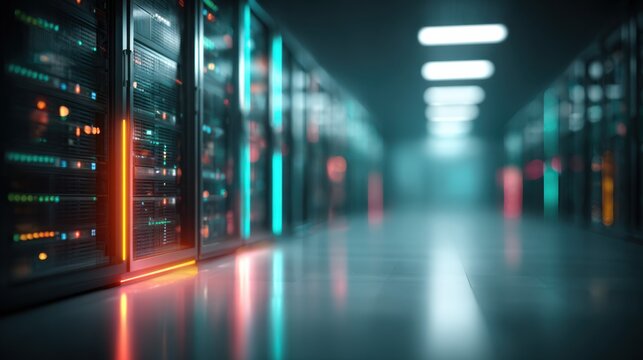 Futuristic Data Center with Illuminated Server Racks