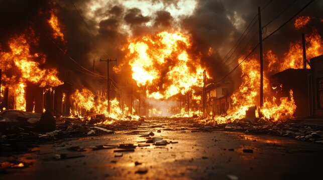 An apocalyptic scene filled with raging flames and billowing smoke, portraying the intense chaos and destruction that reflects deeper themes of loss, despair, and societal conflict.
