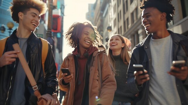 group of friends walking down a city street, their phones capturing the moment as they laugh and chat.