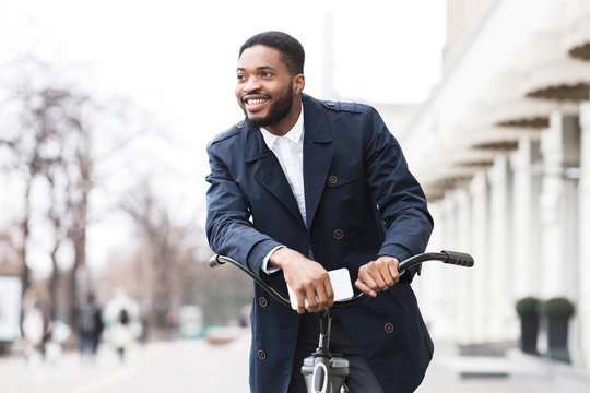 African american man in urban setting commuting by bicycle