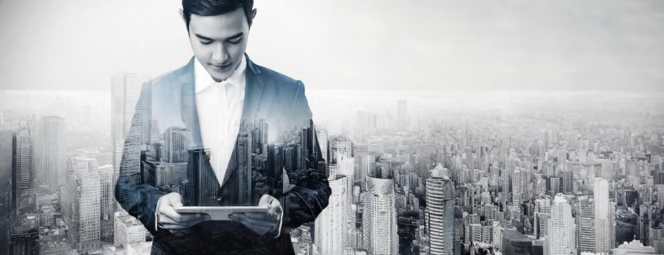 Man in a suit using a tablet with city overlay. A businessman focuses on a gadget, superimposed with an urban cityscape, representing digital security or smart city concepts. Panorama with copy space.