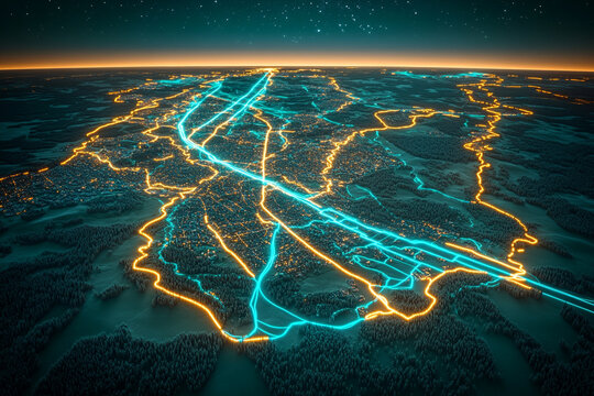 Concept Baltic States leaving, withdraw from Russian BRELL power grid. Synchronous grid of Continental Europe. High electricity poles in urban area connected to smart grid. AI