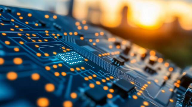 A digital overlay of green circuitry and a leaf against a blurred city skyline at sunset, symbolizing the fusion of nature and technology.