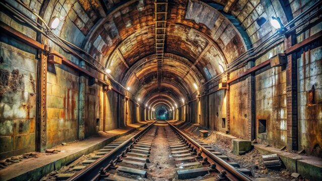 Decrepit underground tunnel with rusty rail tracks, showing signs of decay and neglect, abandoned, derelict, eerie, urban exploration