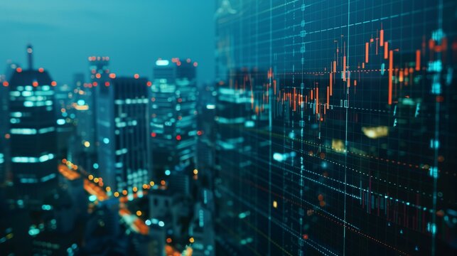 Cityscape with financial graph overlay and blurred background at dusk