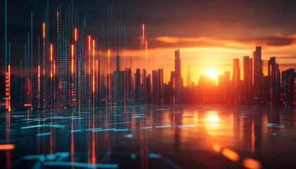 Futuristic urban landscape showcasing interconnected city elements with data flow lines