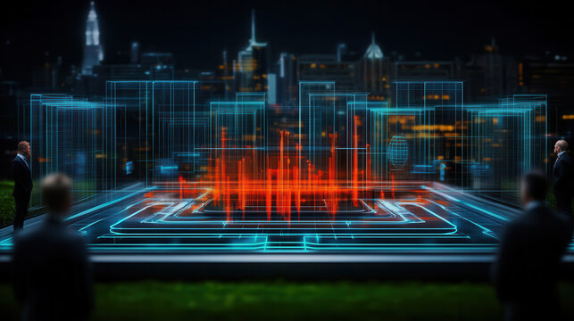 Futuristic financial data visualization over urban skyline