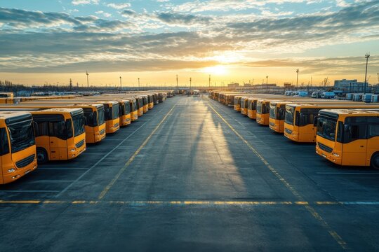 Buses lined up at a depot during sunrise in an urban area