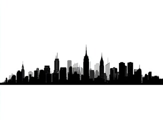 A black-and-white silhouette of New York City skyline with prominent buildings and the Statue of Liberty positioned on the far right side.