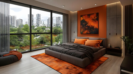 Modern bedroom with a large window overlooking a city skyline, featuring a gray bed with orange pillows, a large abstract painting on the wall, and a brown leather pouf in the corner.