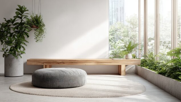 Minimalist, light-filled room with wooden bench and pouf