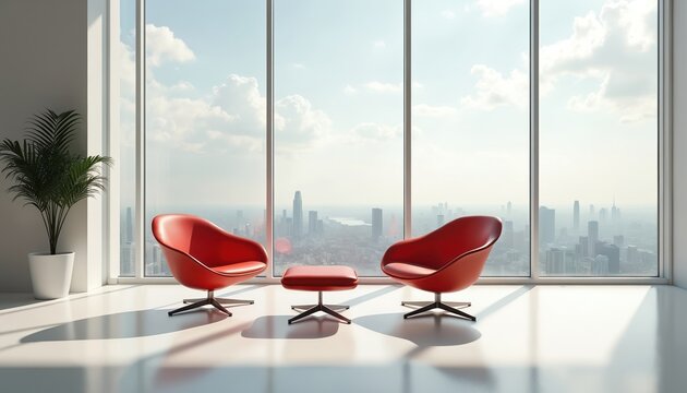Two red chairs and ottoman sit before floor to ceiling windows overlooking cityscape. Bright modern office lounge offers city view. Plant adds touch of nature to interior space.