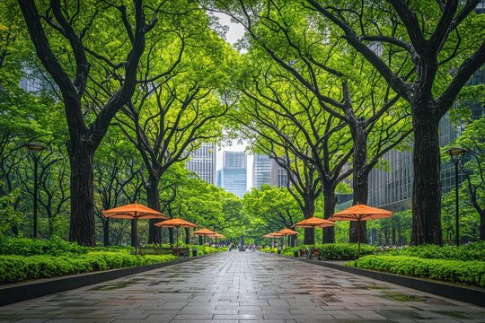 Drone swarm delivering orange cargo over urban promenade, pedestrians filming city skyline
