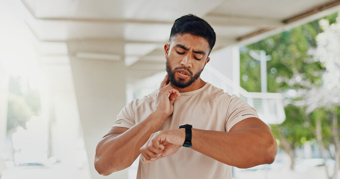 Fitness, smart watch and man check pulse after training, exercise or workout progress on app. Heart rate, time or runner outdoor for health info, performance results or monitor wellness stats in city
