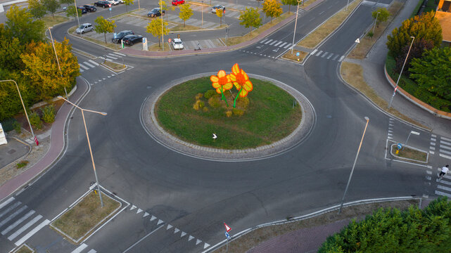 Aerial view of a large roundabout with large orange flowers in the middle. On the road there are no cars.